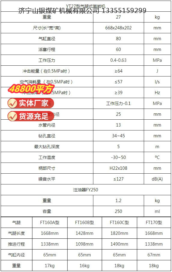 YT27型氣腿式鑿巖機適合在中硬和堅硬(f=8~18)巖石中的鉆水平和傾斜孔??讖椒秶鸀?4~45毫米,有效的鉆孔深度可達 5 米。根據(jù)不同的隧道掘進和作業(yè)條件可以與 FT160A型氣腿、FT160B型短氣腿、FT160C型長氣腿配套使用,金屬礦山還可配套FT170型氣腿,也可與鉆車或鉆架配套使用進行干式或濕式鑿巖。